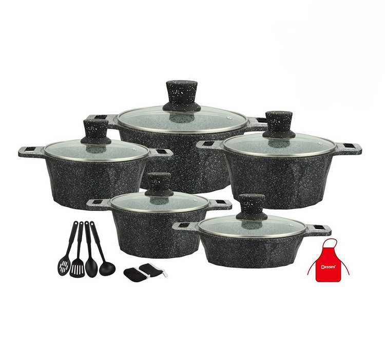 سرویس17 پارچه شامل: قابلمه 20 سانتیمتری (2.4 لیتر)، 24 سانتیمتری (4.4 لیتری)، 28 سانتیمتری (6.6 لیتری)، 32 سانتیمتری (9.6 لیتری) قابلمه, تابه عمیق 28 سانتیمتری (4 لیتری) و ۷عدد وسایل اشپزی