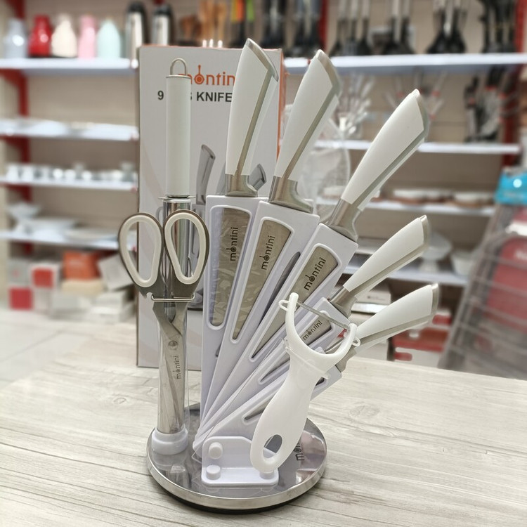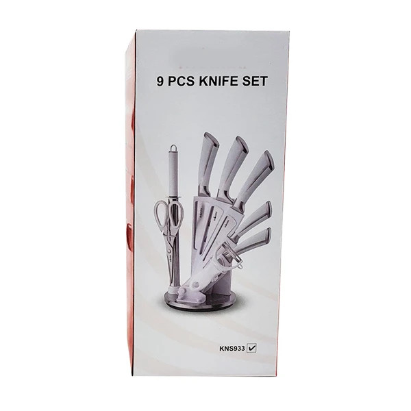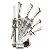 سرویس چاقو ۹ پارچه رنگ دسته و استند ترکیب سفید و استیل ۱ عدد ساطور ۴ عدد چاقو آشپزخانه در سایز های مختلف ۱ عدد چاقو تیز کن ۱ عدد قیچی آشپزخانه ۱ عدد پوستکن ۱ عدد استند چاقو