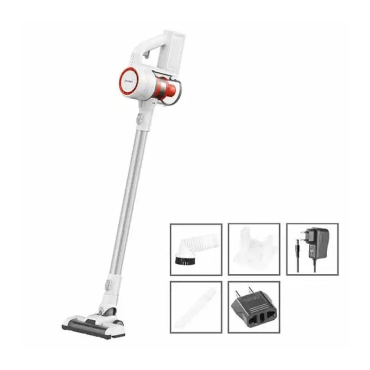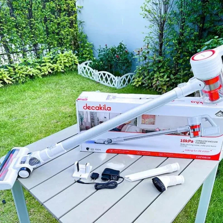 محتویات جعبه: جارو برقی قابل حمل دیکاکیلا مدل CUCV001W، شارژر، نازلهای مختلف، دفترچه راهنما